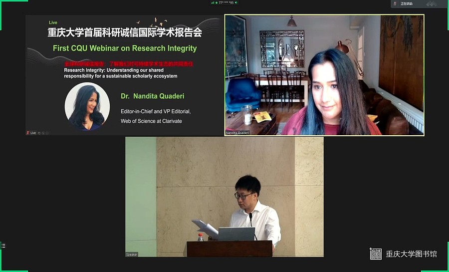 重庆大学副校长明炬代表学校致辞。会议特邀科研诚信领域知名专家浙江大学张月红编审、科睿唯安Web of Science总编辑Nandita Quaderi 博士和科研诚信顾问Elisabeth Bik博士作学术报告。重庆大学社科处、期刊社、本科生院、科发院、研究生院、科学技术协会秘书处(校学术道德专委会办公室)及有关职能部处负责人,各学部、各学院相关负责人,校内各学术期刊编辑部负责人,以及来自海内外高校师生、科研人员、学术期刊编辑等,约万余人通过线上线下形式参加报告会。本次学术报告会由重庆大学英文学术期刊Nano Materials Science执行副主编、重庆大学材料科学与工程学院张育新教授主持。