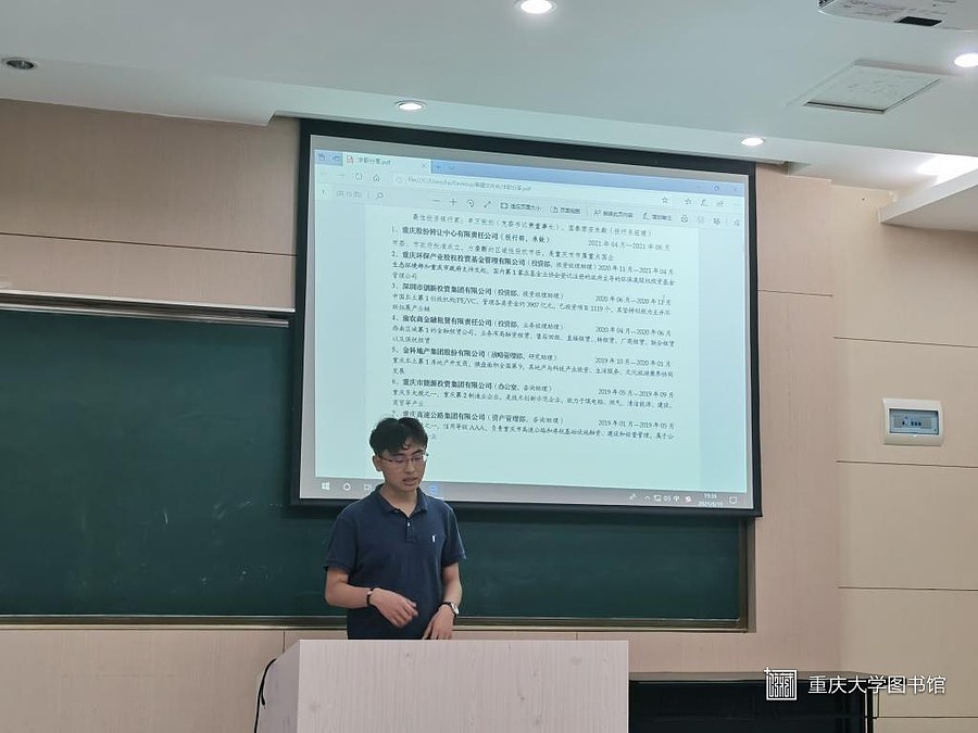 为加深同学们对证券、地产行业的了解,同时指导同学们对未来职业发展道路建立良好的全局观,2021年6月10日晚7点30分,重庆大学金融协会在A区经管楼202教室举办了“薪火相传,职点迷津”择业分享会。本次活动邀请来自2018级工商管理专业的两位嘉宾苏涛和唐超玥同学分享了证券、地产行业的实习与就业情况,通过经验分享、座谈交流的方式,解答同学们的疑惑。