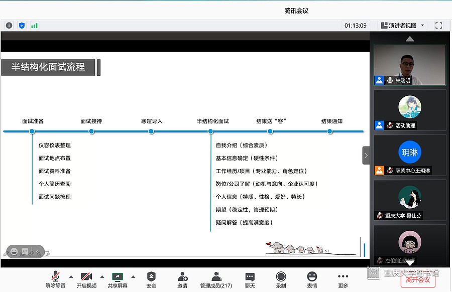 9月18日下午,职通讲坛98期“世界500强集团HR分享给你的面试与就业攻略”线上主题讲座通过腾讯会议顺利举行,讲座邀请美的集团IoT事业部HRD,美的集团校园招聘城市总监朱瑞明进行分享,重庆大学和三峡大学220余名学生参加了线上讲座与交流。