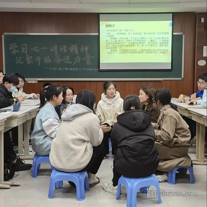 该环节共有三个游戏,分别是无声“接头”、谁是幸存者和数鸭子。通过“⽆声接头”游戏,同学们加强了团队合作能⼒和语⾔表达能⼒。谁是幸存者通过“抢板凳”提高了同学们的⾝体反应和协调能⼒。而围圈“数鸭⼦” 考验的则是同学们的思维反应速度。室内素拓不仅使同学们的身心得到了放松,也增强了团队凝聚力。