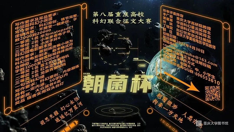 寒假,你无所事事地刷着手机,突然发现寡淡的现实逐渐扭曲闪烁:鲲鹏的巨影从手机中暴涌而出,屏幕变成了深空,点点幽光浮起。茫然间你抬头,看到那蓝得发黑的天空闪烁,看到群星与日月同台,看到太空巨兽与星舰共舞;无可言述的喜悦与恐惧直击你的灵魂。你凝视着群星的绘卷,每一个星点都在告诉你它所有的故事,而所有的星点在一起,构成了天空巨幕上的字符:第八届重庆高校联合科幻征文比赛正式启动