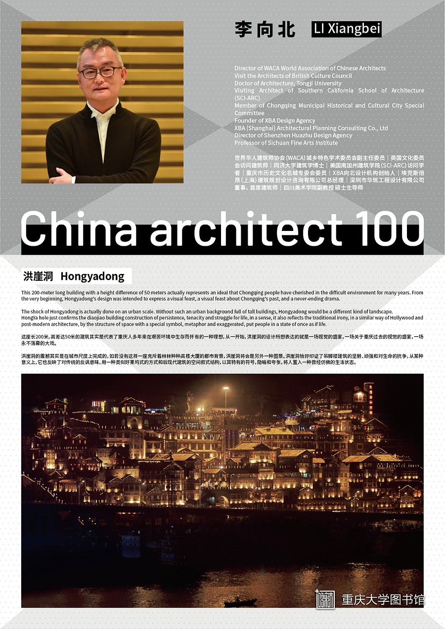 李向北,1983级本科建筑学专业,1998年参与创办重庆大学人文艺术学院艺术设计系,四川美术学院副教授、硕士生导师。WACA世界华人建筑师协会理事,英国皇家特许注册建筑师,XBA向北设计机构创始人。曾获2011年度中国建筑鲁班奖,世界华人建筑师大奖提名奖等,代表作品有:重庆洪崖洞 、重庆礼嘉智慧公园5G及系列场馆、重庆建工产业大厦、金隅大成·南山郡等。