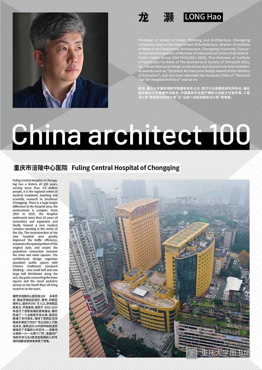 龙灏,1986级本科建筑学专业,随后分别于1993年和2009年取得硕士和博士学位。现重庆大学建筑城规学院教授、博士生导师、建筑系系主任。他致力于将教学、研究和项目设计有机结合并形成良性循环,主要研究方向为医疗建筑、居住建筑、城市更新设计及其理论,出版专著、编著及译著10余本。曾应邀参展第17届威尼斯国际建筑双年展中国国家馆,建成作品有重庆医科大学附属第一医院外科大楼、重庆涪陵中心医院整体更新工程、重庆市第一中学学校安危改工程第二、三期工程设计等。